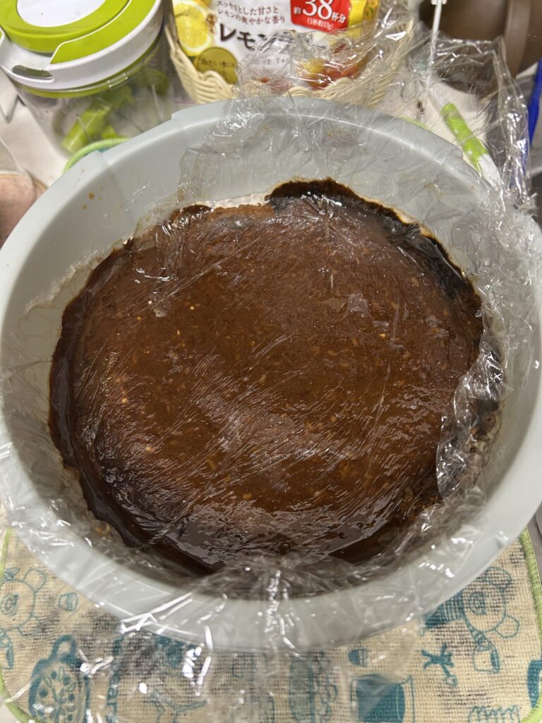 次にしゃもじを使って、樽の中で味噌を天地返しのようにして混ぜます。その後、発酵を止めるため冷凍保存しました。 味噌って放置しておくとどんどん発酵するんだそうです。 市販の味噌って、どうやっているんだろうと考えてしまいます。冷凍していても、すぐに料理に使えるみたいです。